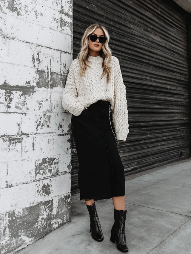 5. Black Maxi Skirt + Knit Sweater + Boots