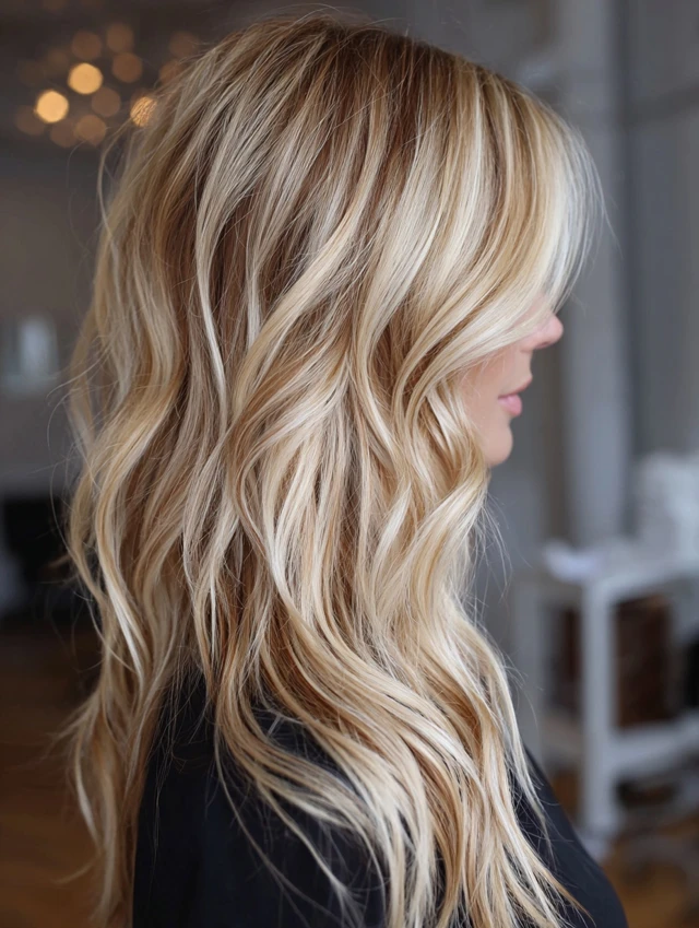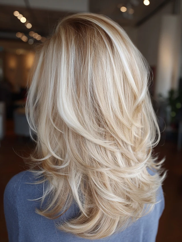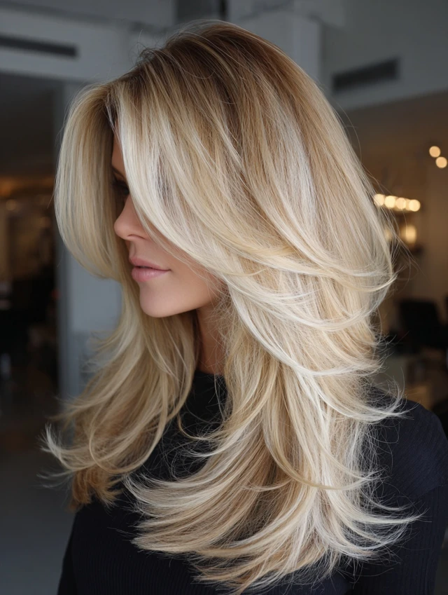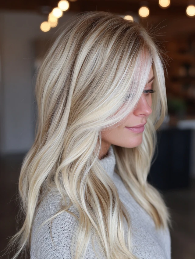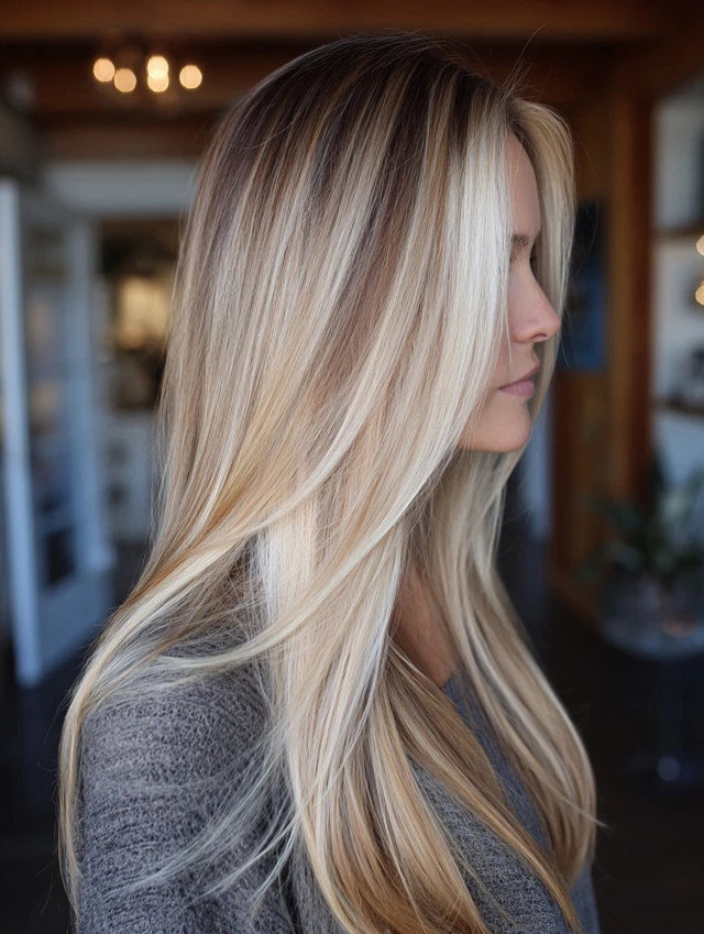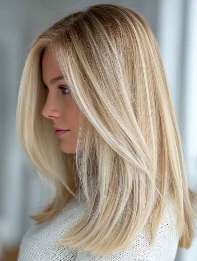 Sleek, straight hair highlights the smooth blend of blonde tones.