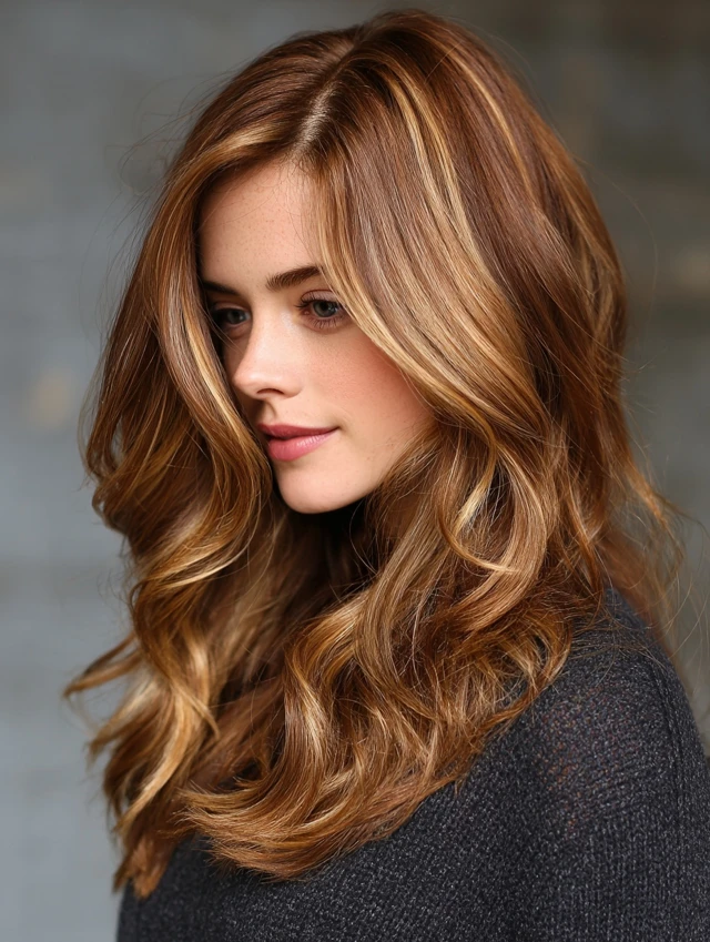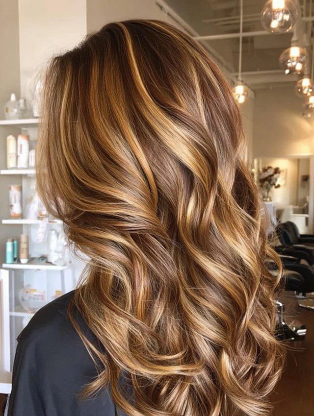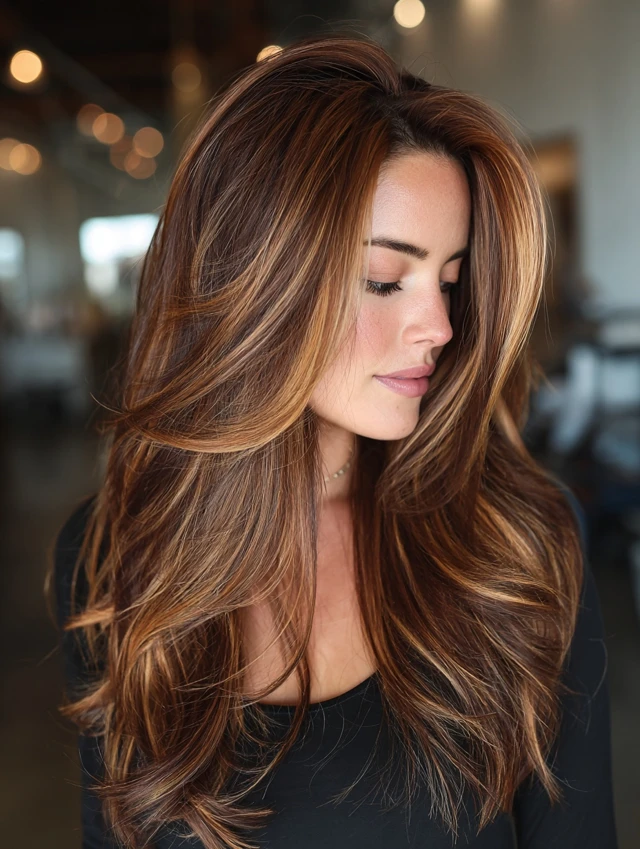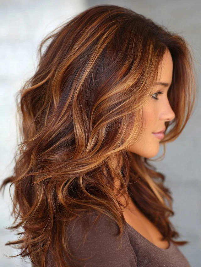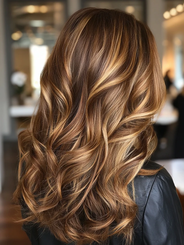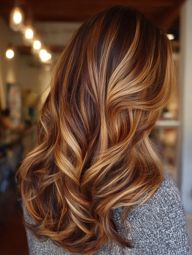 Warm caramel highlights paired with deeper brown or chocolate lowlights.