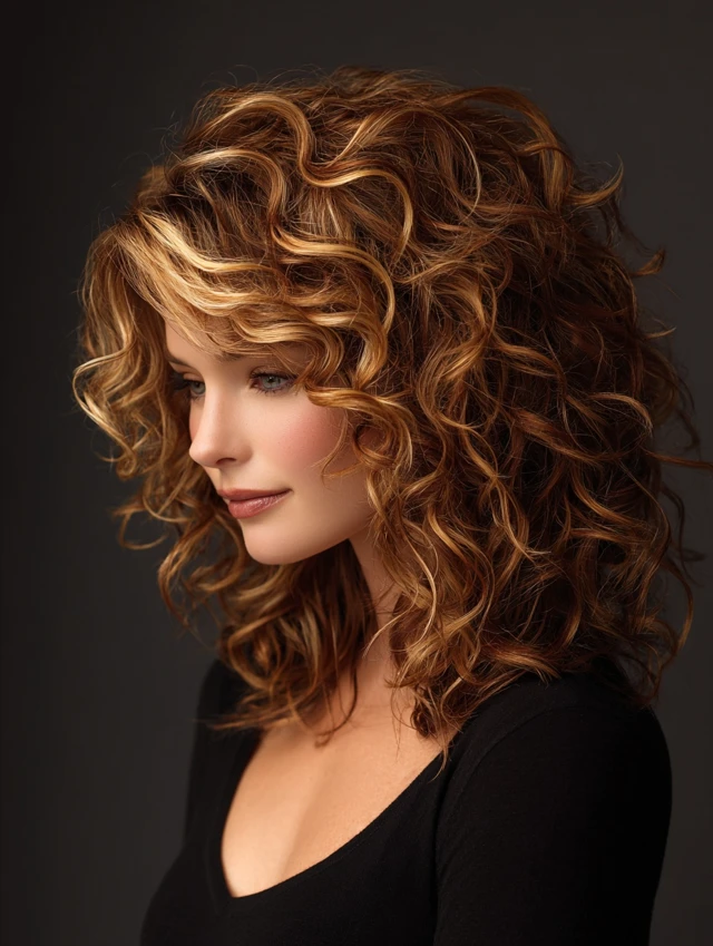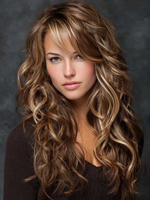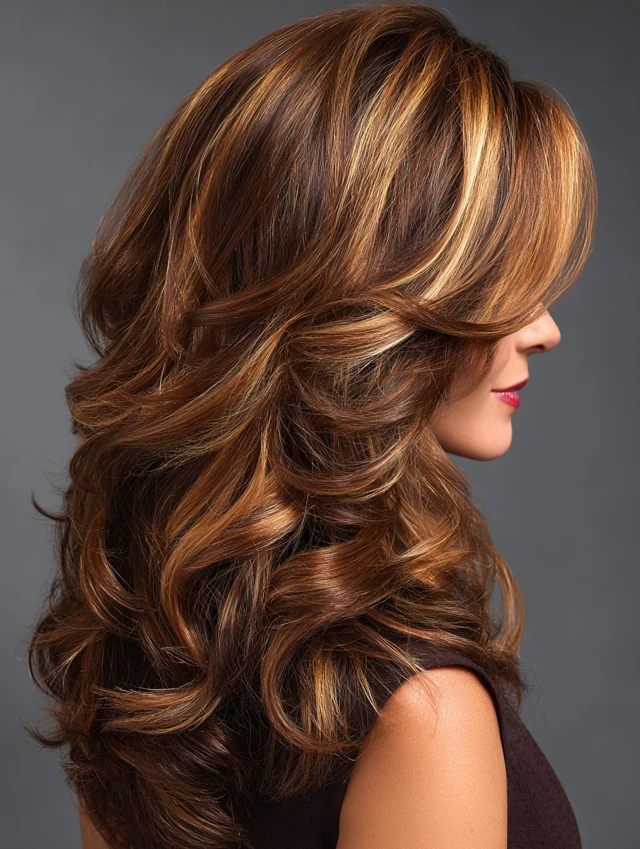 The mix of light caramel tones and darker lowlights creates depth and contrast.