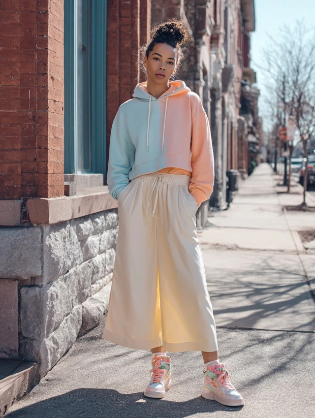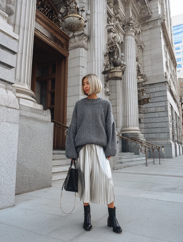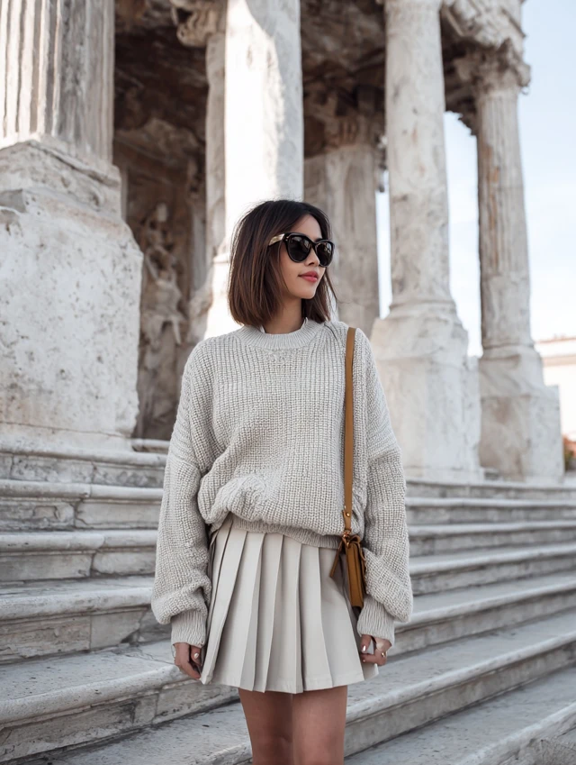 - Foundation: Skirts, pleated minis, oversized sweaters, or pastel jeans.