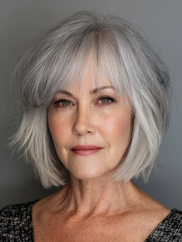 Bangs soften the face and add a flattering frame.