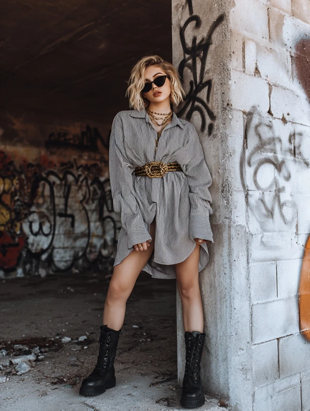 3. Oversized Shirt Dress + Belt + Combat Boots